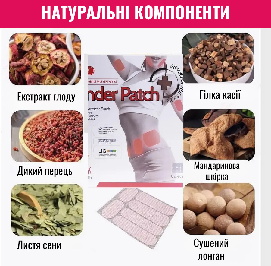 Wonder Body — це інноваційний пластир для схуднення, який допомагає позбутися зайвих кілограмів без дієт та виснажливих тренувань. Завдяки натуральним компонентам він прискорює обмін речовин, стимулює спалювання жиру, зменшує апетит та виводить надлишкову рідину з організму.